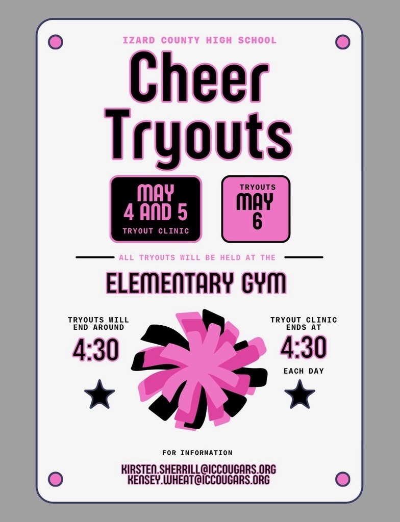 If you are currently in grades 6-11 and interested in being part of next year’s team, make plans to attend the cheer clinic on May 4 and May 5, followed by tryouts on May 6.